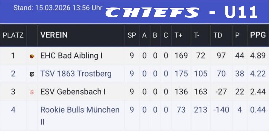 Samstag14.03.202609:15Rookie Bulls München4 : 32Trostberg CHIEFS/U111 : 10 + 3 : 13 + 0 : 9